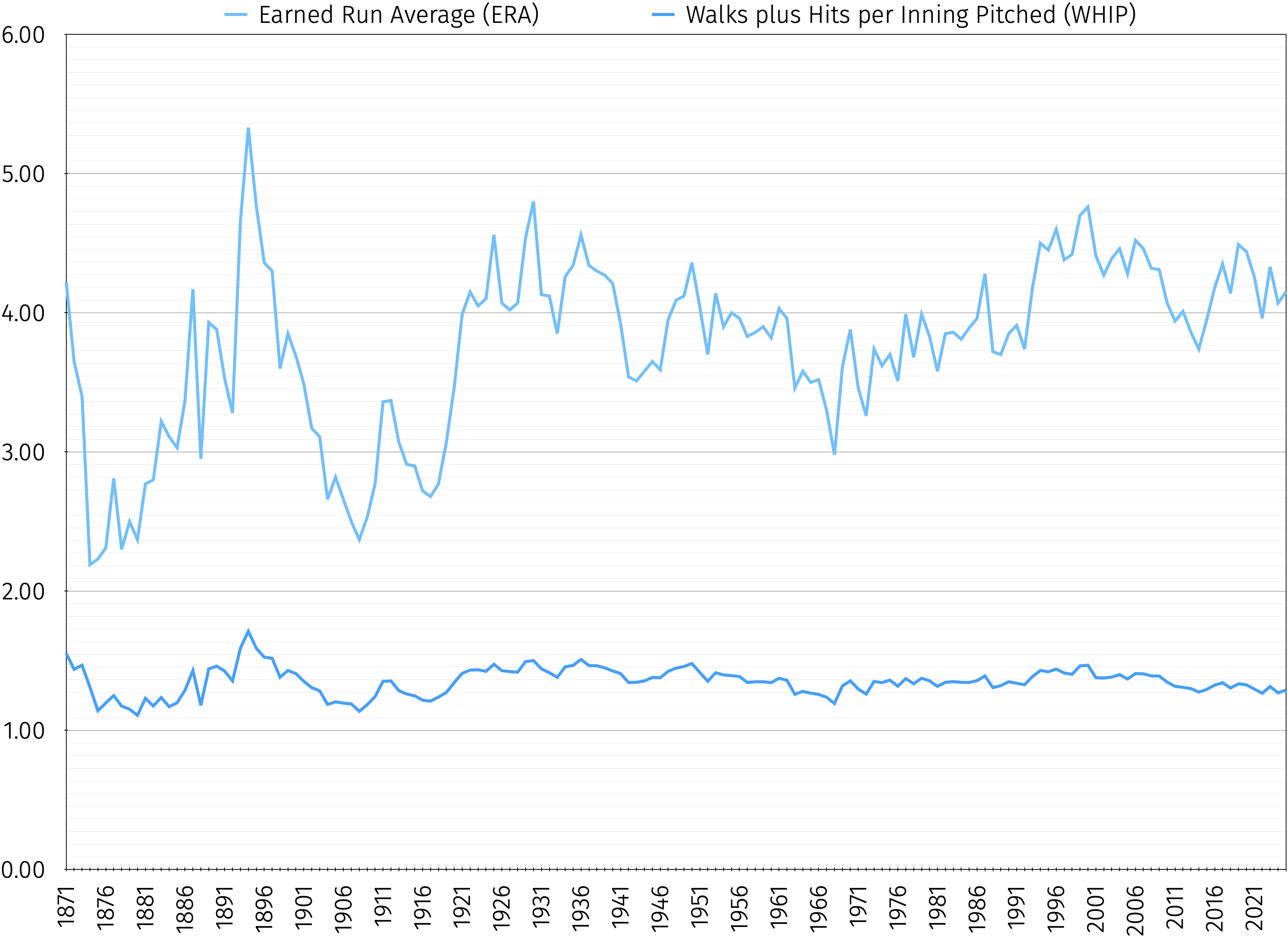 The modern leader, , retired in 2013 with a 2.209 career ERA. Rivera was primarily a reliever, meaning that he worked in smaller spans. Relievers tend to have lower ERAs. , who just retired, has the lowest career ERA among modern starters, with 2.534. The increase in ERA over the years is less due to a decline in pitching quality and more due to rule changes and an increase in hitting quality.